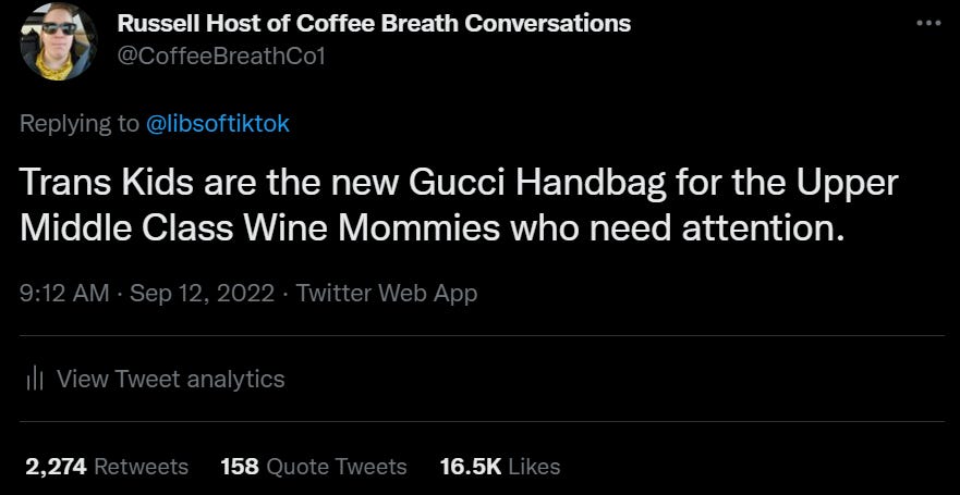 At 0912 I sent off an innocuous tweet poking fun at a Libs of Tik Tok repost about a woman talking about how at 18 months she knew her child was transgender. I sent it in part because I am tired of parents, although usually it’s upper class wine moms, posting about their supposed transgender kids. Look if your 18 or older I don’t really care about what you do with your body, that’s your personal choice. You want to chop off parts, add parts, etc.… that is your choice. I don’t have an issue with people claiming to be Transgender. What I do have a problem is when parents parade their children around like a Gucci Hand bag to be shown off claiming that they are transgender. The trans child in my opinion is the ultimate bid for clout and a dangerous one at that for the child. The push for affirmation can open the door to predation towards the child from their unstable parental figures. There appears to be a disproportionate number of trans children amongst the affluent and celebrity class, an uneven scale. Is that because the child is that much more free to be themselves or is something more nefarious at play? Although I never believed the tweet would take off as it did, in the end the satire I aimed for has purpose.